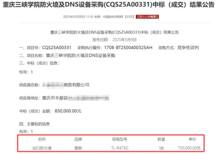 据中国政府采购网2025年5月9日发布的《重庆三峡学院防火墙及DNS设备采购(CQS25A00331)中标(成交)结果公告》显示,主要标的信息中,出口防火墙一栏,显示采购产品为1台“普联TL-R473G”,其单价为75万元。中标信息则显示,供应商为重庆丰都县某商贸有限公司。